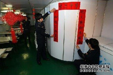 除夕午后,新华视点微博从全球征集近400条春联,由网友“知性的DONGDONG”“龙的年”“木晓文德堂”制作的三幅作品中选,由队员手书贴上海监船驾驶舱、 食堂、甲板,随海监船第一次于春节赴钓鱼岛海域巡航。
