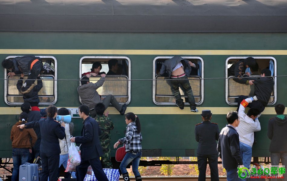 2009年1月12日,广东惠州火车站,深圳西-信阳普快列车,旅客来不及从车门登车,只能爬车窗。